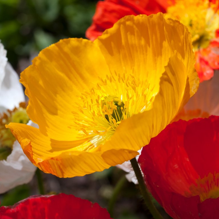 Auf fein behaarten Stielen sitzen zarte schalenförmige Blüten . In größeren Gruppen setzen - das farbenprächtige Blütenmeer ist von einzigartiger Leuchtkraft!