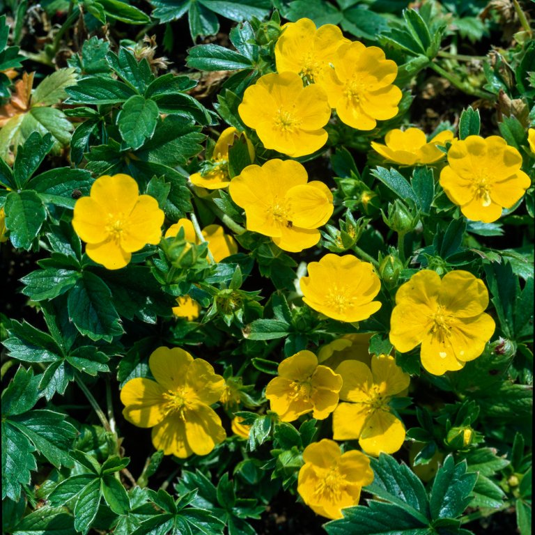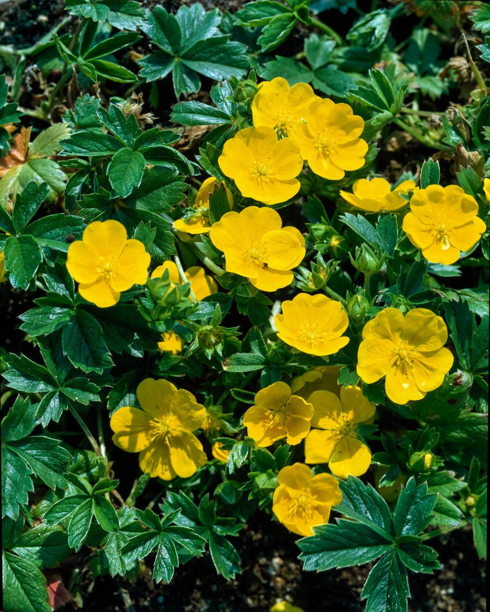 Das Fingerkraut wächst mattenförmig und schließt schnell kleinere Flächen. Zwergglockenblume, Küchenschelle und Staudenlein sind schöne Begleiter.