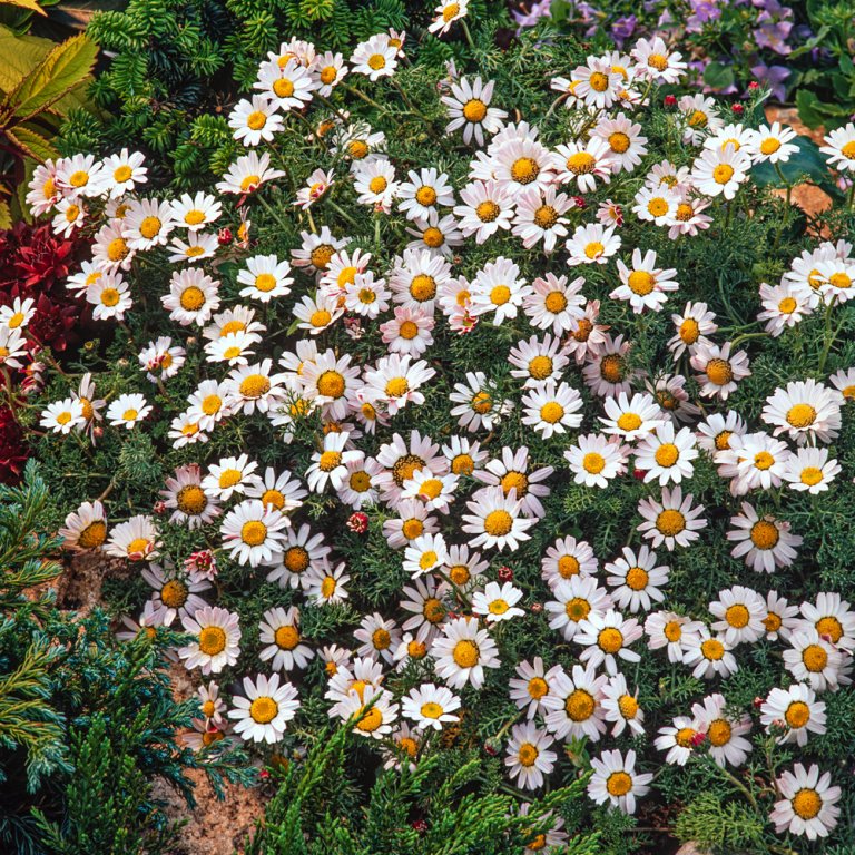 Die Zwergmargerite liebt sonnige Stellen auf trockenen, steinigen Böden. Mit ihren kleinen, feingefiederten Blättchen bildet sie flache Polster.