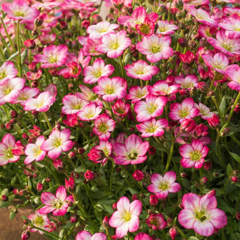 Moosartige, große Polster bildende Staude. Im Winter, wenn der Reif den immergrünen Rosetten weiße Ränder zaubert, hat der Moossteinbrech noch einmal seinen großen Auftritt.