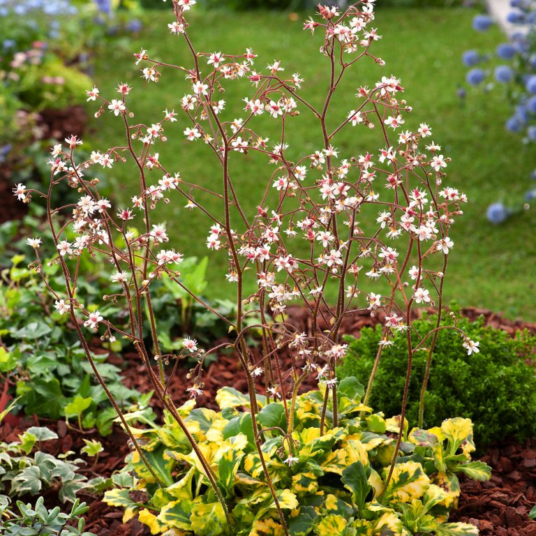 Dieser Steinbrech eignet sich vorzüglich zum Bedecken kleinerer Flächen zwischen Gehölzen und für Beeteinfassungen. Aus den Blattrosetten treiben Rispen mit sternförmigen Blütchen.