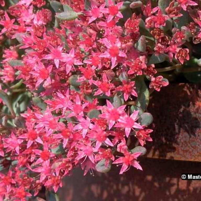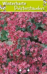 Dieses Sedum besticht durch sein stark blaugrau bereiftes, rötlich purpurn gerandetes Laub. Im 8 wird dieses Polster mit dichten karminroten Blütendolden überzogen.