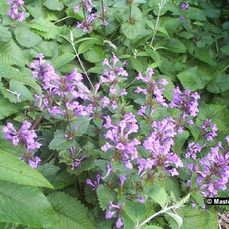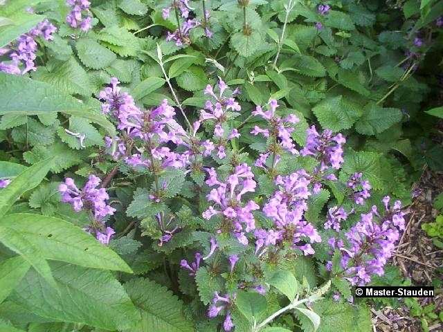 Über ihrem dichtbuschigen Blattwerk erscheinen ab Juli purpurrosafarbene Blüten in dichten, großen Quirlen. Sehr robuster Bodendecker.
