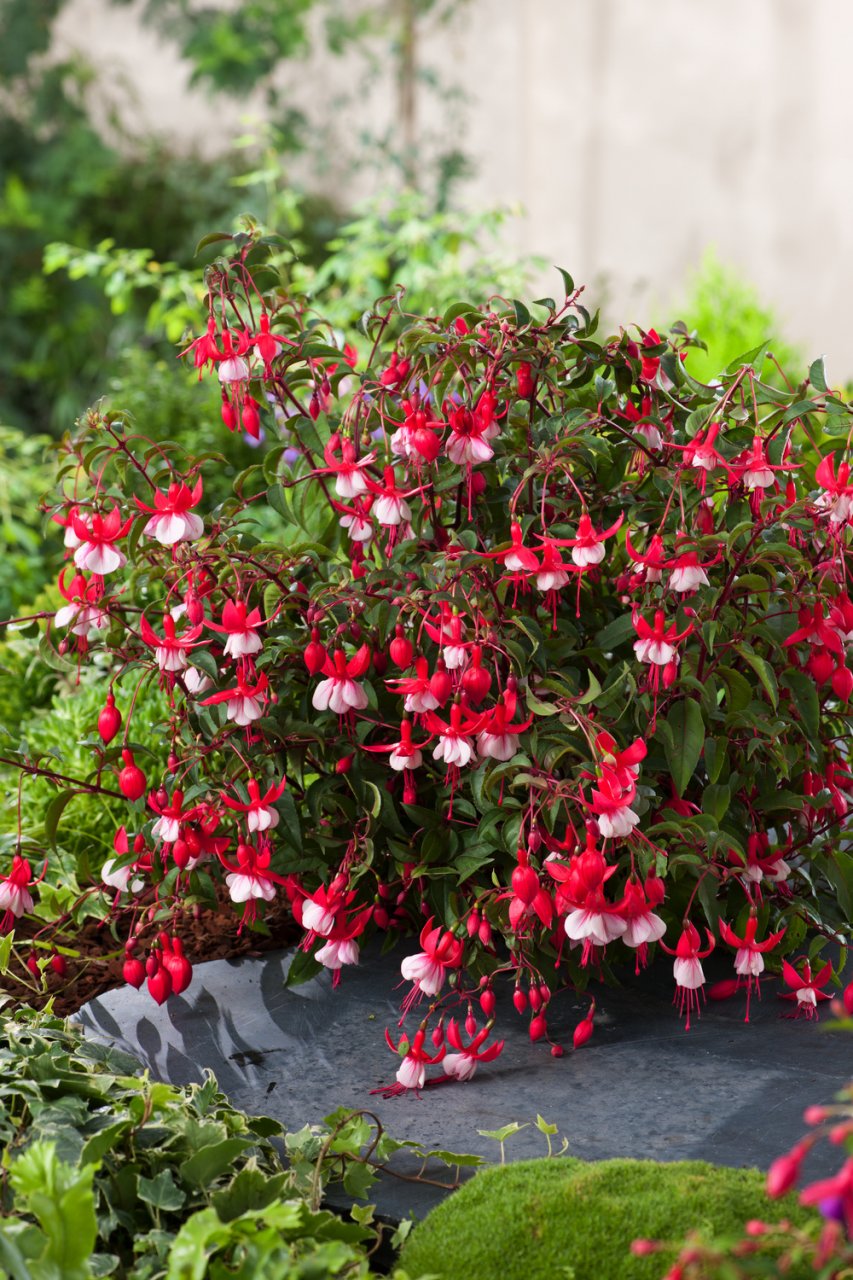 Pflege: Laubdecke als Winterschutz. Die Winterharte Fuchsie ist ein graziler, leicht überhängend wachsender, unermüdlicher Sommerblüher, Nachbarn: Silberkerzen, Funkien oder Farne.