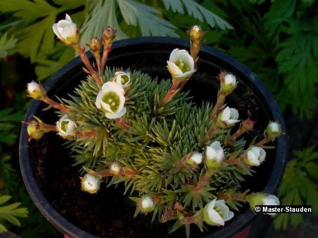 Blühwillige, schnell wachsende Staude. Ihre harten, immergrünen Polster aus stacheligen graugrünen Blättern bilden bald große Matten und überwuchern malerisch Steine.
