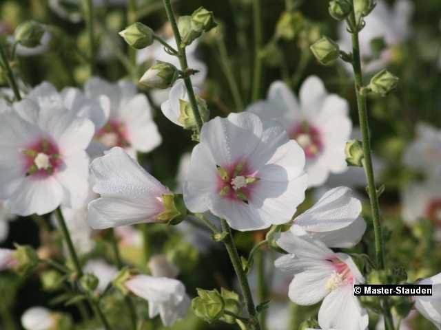Im Sommer schmücken große, purpurrote oder weiße Blütenschalen mit rosafarbenem Auge diese buschig wachsende Blütenstaude. Im Winter einen Frostschutz aus Laub im Wurzelbereich.