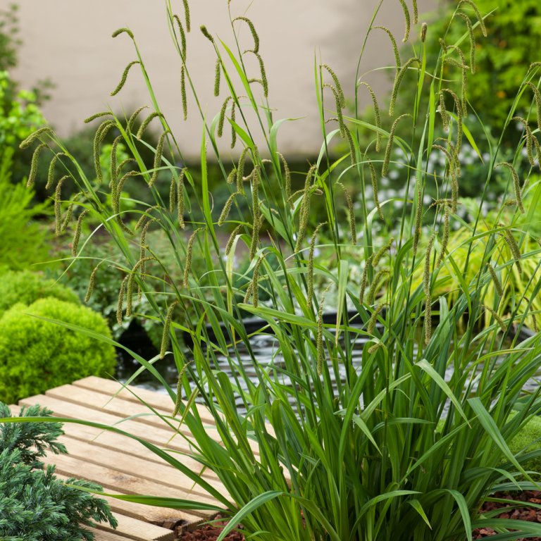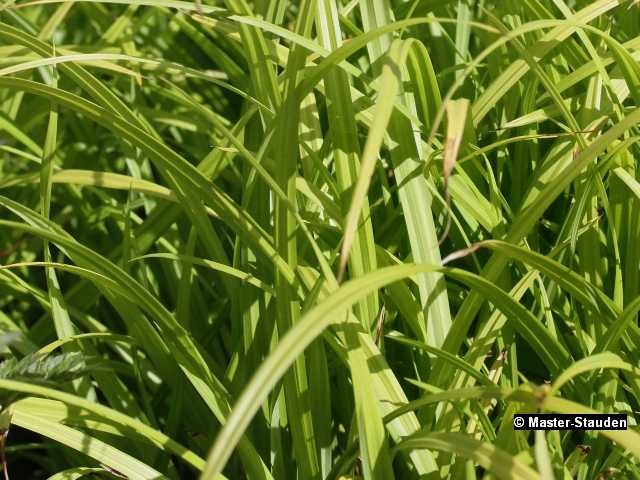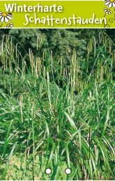 Ein besonders dekoratives Gestaltungselement ist die Riesensegge. Sie bezaubert den Betrachter mit ihren zahlreichen, dekorativ überhängenden Blütenrispen. Die immergrünen Horste dieser Segge machen sie für Gehölzunterpflanzungen unverzichtbar. Sie ist ausgezeichnet zum Schnitt geeignet.