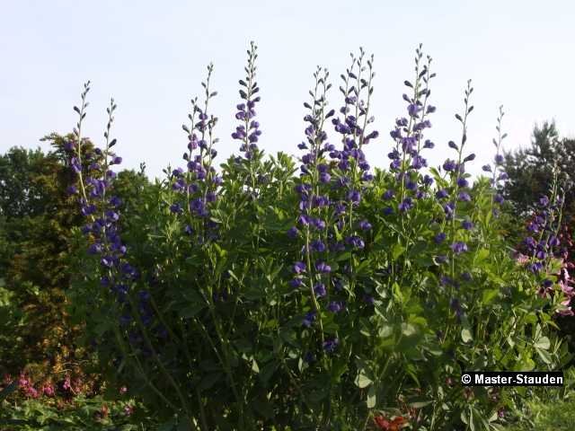 Solitärstaude mit leuchtend blauen lupinenartigen Blüten.Diese Staude ist sehr robust und ausdauernd mit schönem gefiederten Laub. Einmal eingewachsen etwickelt sie sich zu kräftigen, trockenheitverträglichen Horsten. Für gut durchlässige Böden am sonnigen, warmen Gehölzrand. Attraktiv für Schmetterlinge.