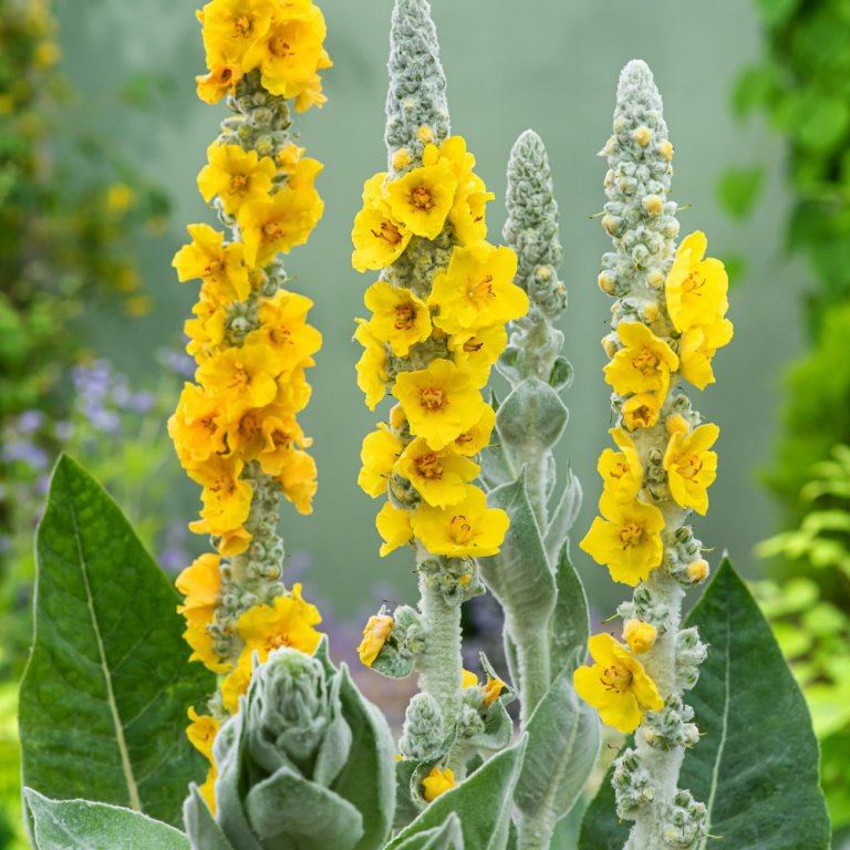 Aus den großen, mit grauweißen Filzhaaren überzogenen Blattrosetten erhebt sich der prächtige, leuchtend gelbe Blütenstand. Die Königskerze gedeiht am besten freistehend, auf mageren, sandig-durchlässigen, trockenen Böden in voller Sonne. Die majestätische Gestalt dieser interessanten Solitärstaude wird sie immer begeistern. Eine hübsche Gemeinschaft bildet sie mit Kugeldistel, Brennende Liebe, Prachtscharte und verschiedenen Gräsern.