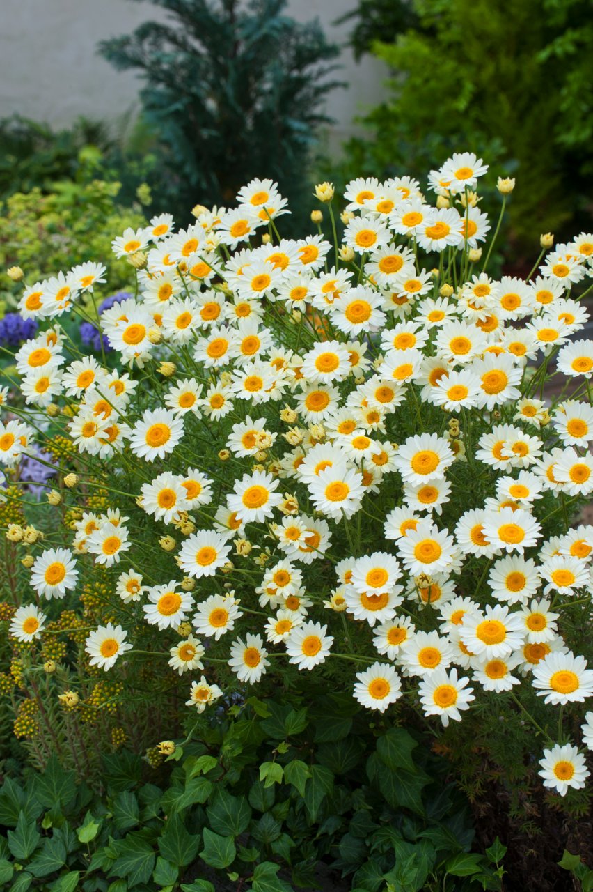 Einfache strahlenförmige weißgelbe Tellerblüte mit kräftig gelber Mitte. Dauerblüher. Ein Rückschnitt Ende August führt zu einer neuen Bestockung und erhöht die Lebensdauer.