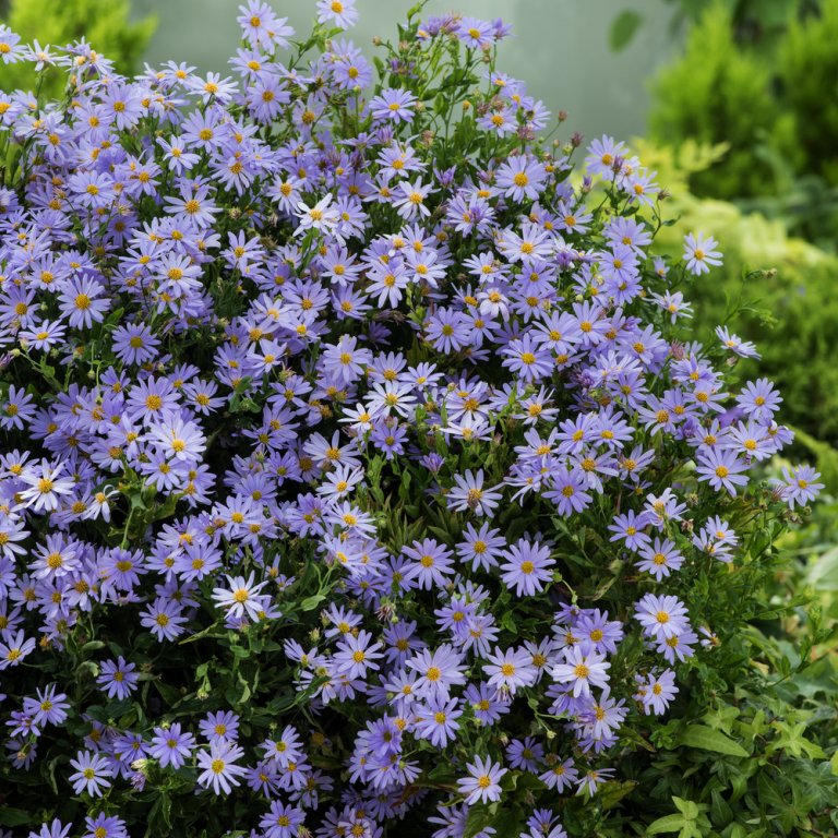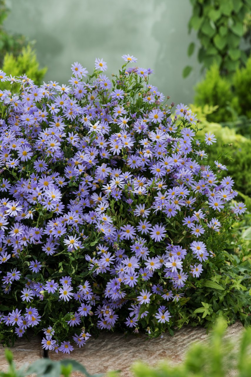 Die Schönaster 'Blue Star'ist eine wunderbar überreich blühende Staude, die auch mit Wurzeldruck oder an relativ trockenem Standort zurechtkommt.Sie büht den ganzen Sommer über mit kleine hellblauen Blüten. Ein Wahrer Insektenmagnet.