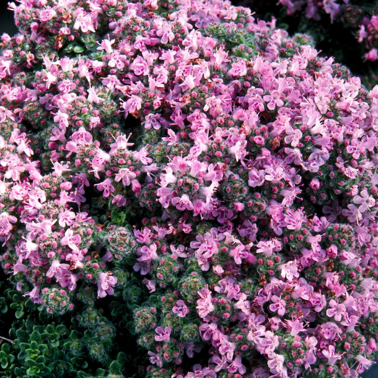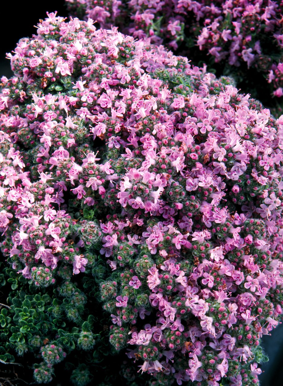 Der Zwergige Thymian bildet niedrige dichte Matten mit aromatisch duftenden, dunkelgrünen Blättchen. Diese werden im Juni bis Juli fast völlig von unzähligen Blütchen zugedeckt. Wertvolle Bienenfutterpflanze. Auch im Winter macht der Thymian noch eine gute Figur mit seinem feinen immergrünen Laub. Er benötigt zum Gedeihen einen vollsonnigen, trockenen und nährstoffarmen Standort. Ideal geeignet sind Steingarten oder Trockenmauern. Auch zur Dachbegrünung oder in Trögen mit gutem Wasserabzug.