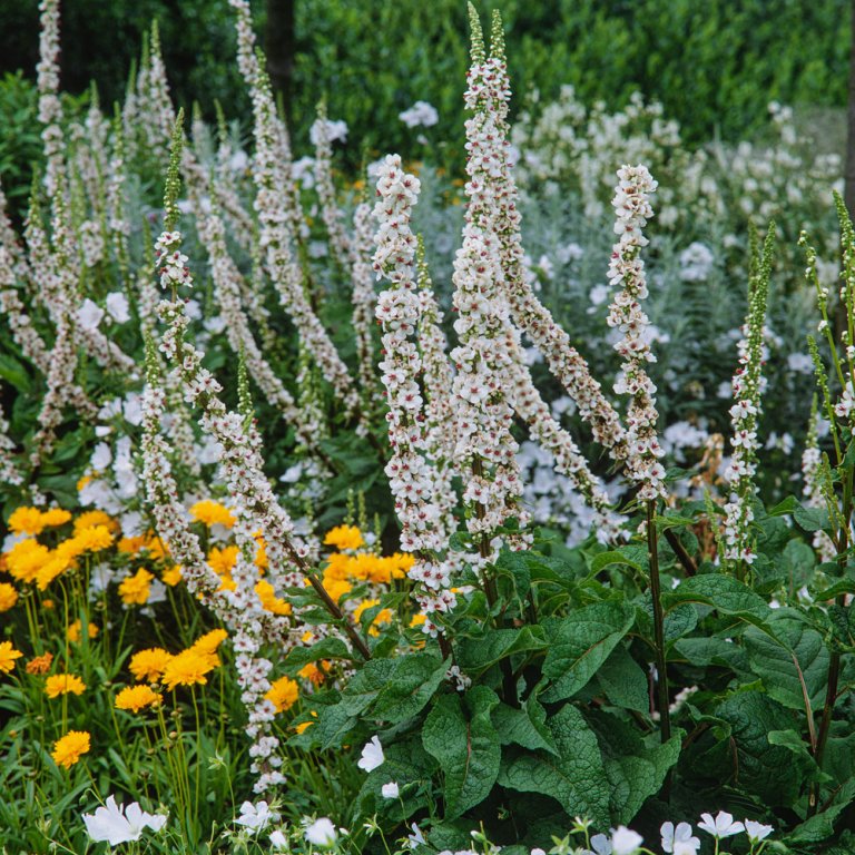 Aus den formschönen Blattrosetten schieben sich die dekorativen verzweigten Blütenkerzen hervor. Die Einzelblüten sind weiß mit violetten Staubfäden und erscheinen im Juni-August. Um eine Selbstaussaat zu vermeiden sollten in kleineren Gärten das Verblühte vor der Saatreife abgeschnitten werden. Eine Staude für trockene und sonnige Standorte. Sie ist eine beliebte Insektenweide.