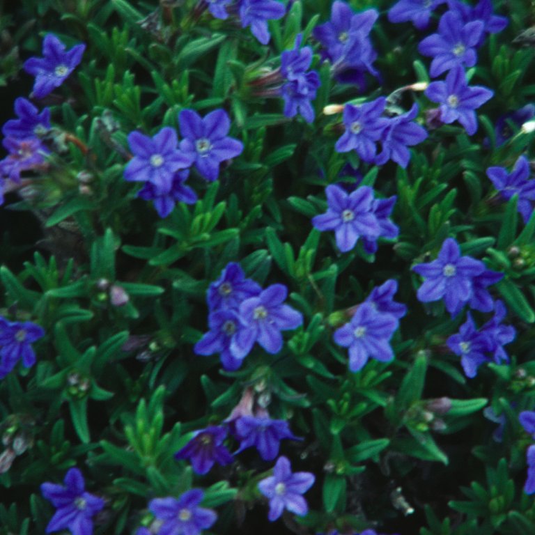 Die Steinsame ist ein blaublühender Zwergstrauch, dessen niederliegende Zweige über den Boden kriechen. Die enzianblauen Blüten harmonieren sehr gut mit dem graugrünen Laub.