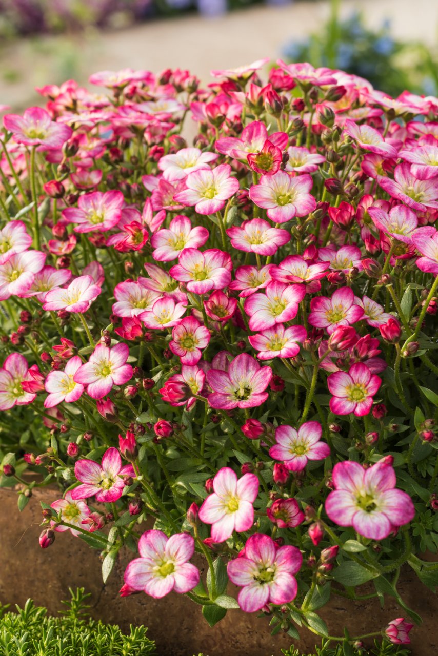 Moosartige, große Polster bildende Staude. Im Winter, wenn der Reif den immergrünen Rosetten weiße Ränder zaubert, hat der Moossteinbrech noch einmal seinen großen Auftritt.