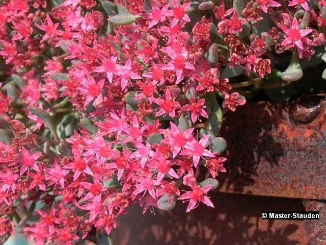 Dieses Sedum besticht durch sein stark blaugrau bereiftes, rötlich purpurn gerandetes Laub. Im 8 wird dieses Polster mit dichten karminroten Blütendolden überzogen.