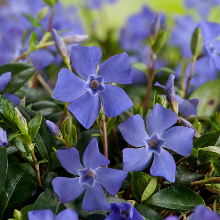 Vinca minor ist ein hervorragender Bodendecker, der dichte Teppiche bildet. Beete unter Gehölzen werden mit dieser Staude sehr schnell begrünt. Vinca ist ganzjährig belaubt.