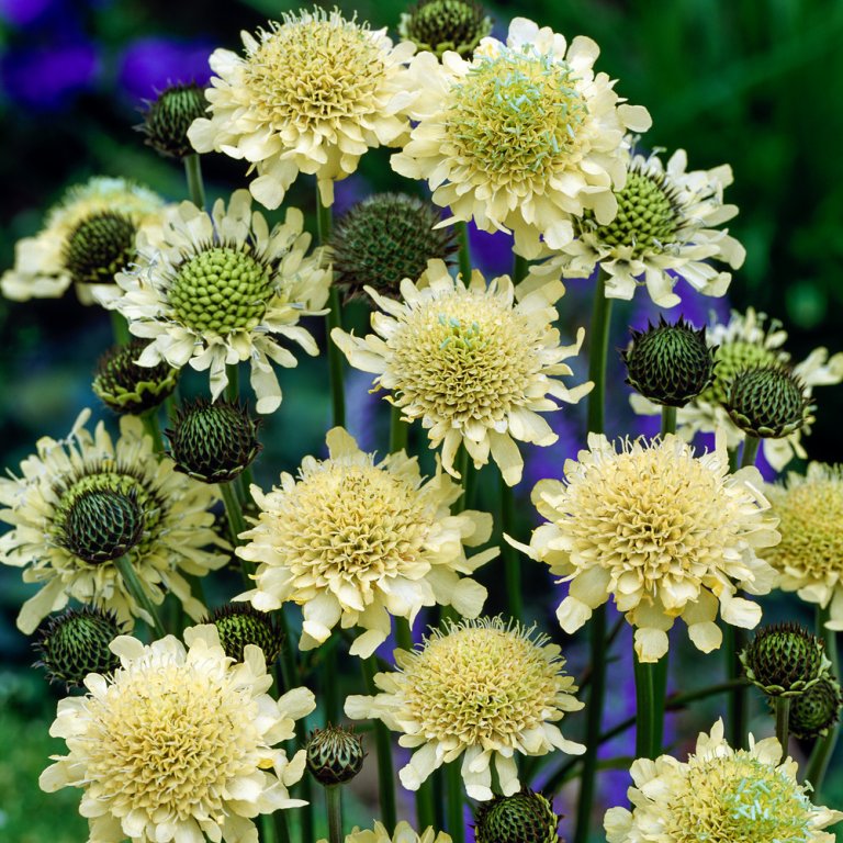 Die imposante Solitärstaude mit stattlichem, sparrig-verzweigtem Wuchs trägt hellgelbe, an Skabiosen erinnernde Blütenköpfchen auf langen Stielen.