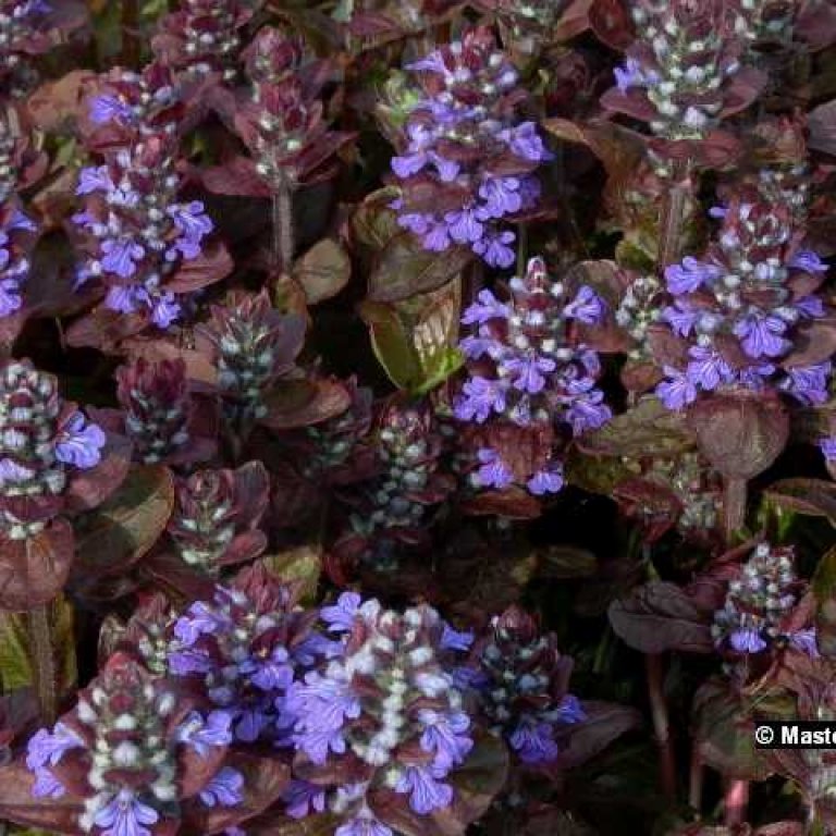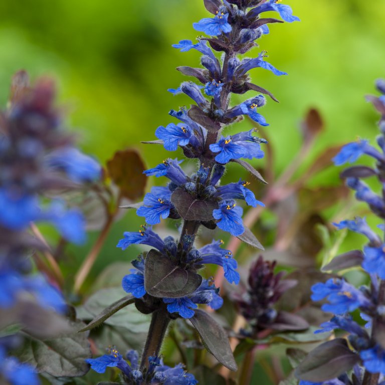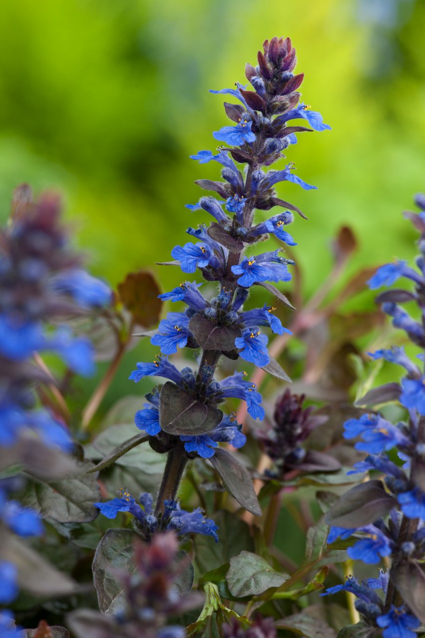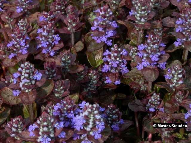 Der Purpurgünsel bildet farbenfrohe dichte Matten. Seine Blüte steht im intensiven kontrast zum Laub. Auch findet man viele Insekten auf den Blüten.