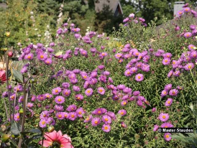 Ihren Namen verdankt diese herbstliche Staude der starken Behaarung ihres Laubes. Aber noch auffallender ist im Herbst ihr Blütenreichtum in rosa, roten, blauen und violetten Farbtönen. Ein Farbenrausch zu einer Zeit wenn nicht mehr viel blüht. Weithin leuchten ihre Blüten, die in großen Doldentrauben sitzen und sich bei Regenwetter schließen. Die aus Nordamerika stammende Pflanze liebt frischen und nährstoffreichen Boden und einen sonnigen Standort und sollte in jedem zweiten Jahr umgepflanzt werden. Goldruten, Sonnenbraut und Sonnenauge und Gartenchrysanthemen passen sehr gut in die Nachbarschaft.