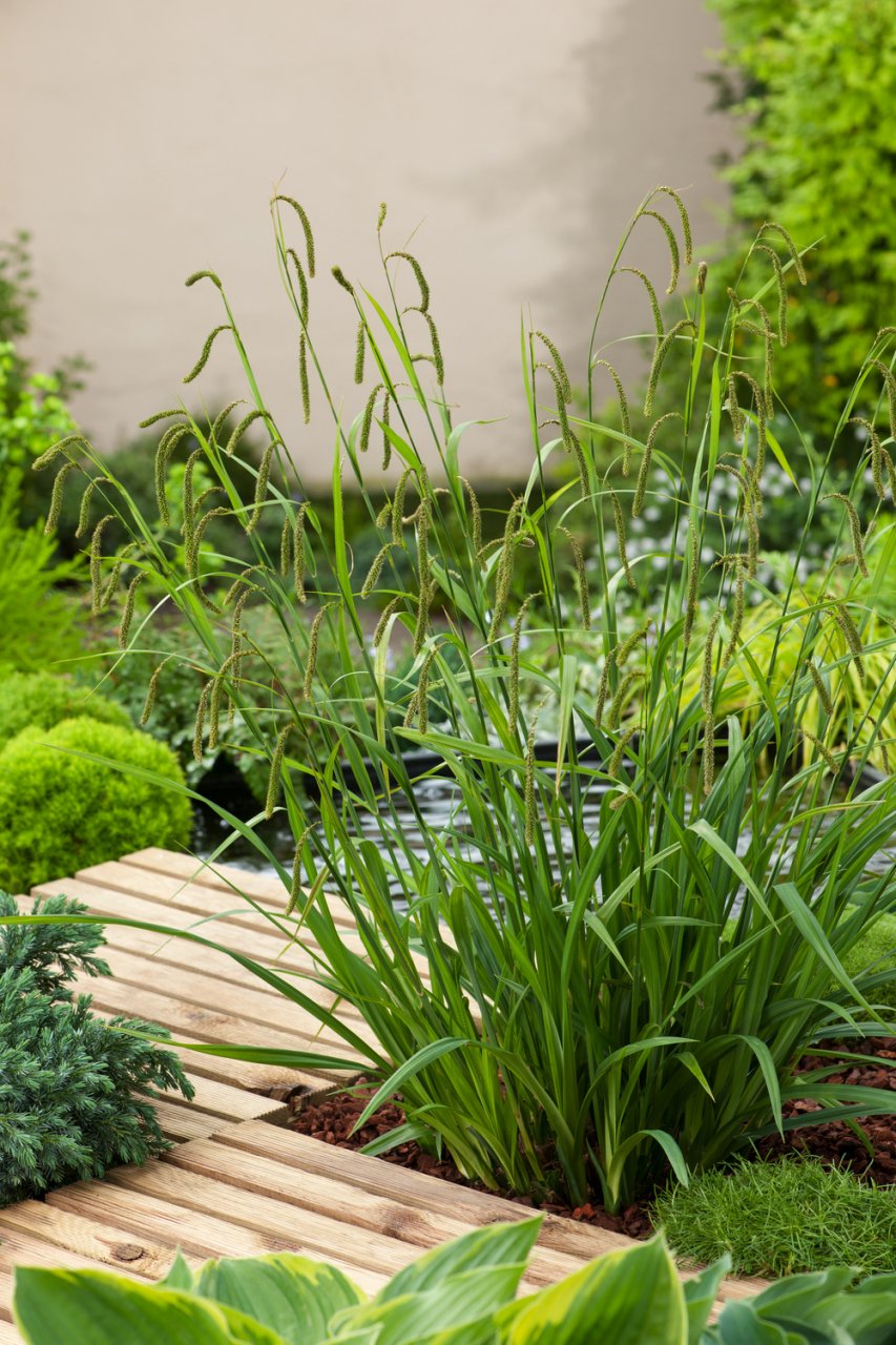 Ein besonders dekoratives Gestaltungselement ist die Riesensegge. Sie bezaubert den Betrachter mit ihren zahlreichen, dekorativ überhängenden Blütenrispen. Die immergrünen Horste dieser Segge machen sie für Gehölzunterpflanzungen unverzichtbar. Sie ist ausgezeichnet zum Schnitt geeignet.