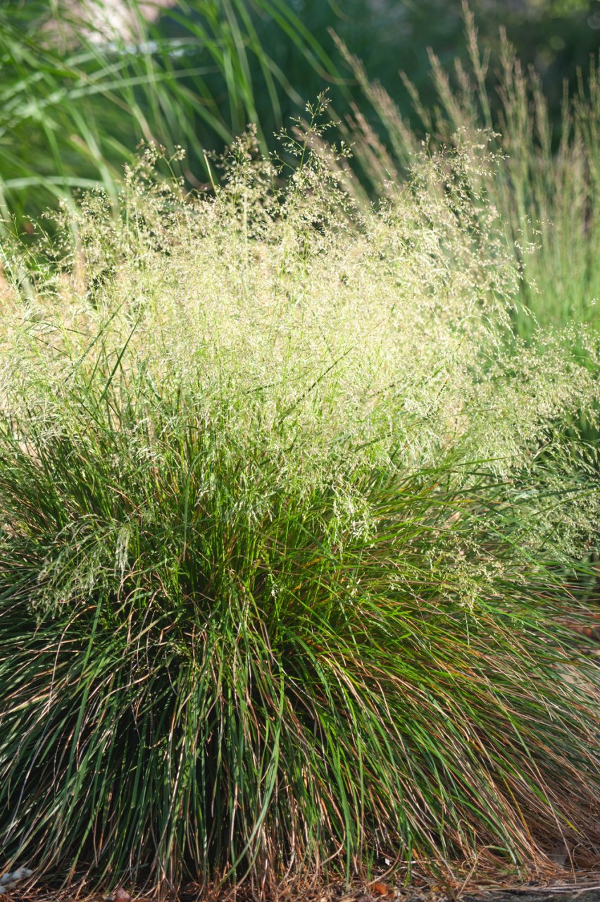 Die lockeren, zarten Blütenrispen der Waldschmiele sehen entzückend aus, wenn sie sich unter dem morgendlichen Tau beugen. Zusammen mit Astilben und Eisenhut pflanzen.