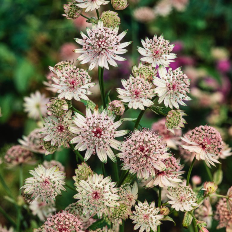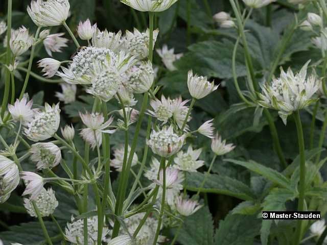 Die Sterndolde eine Bereicherung für jedes Beet. Besonders schön wirkt sie an Gehölzrändern und lichten bis schattigen Wildgartenpartien. Die aufrechten Stiele mit den knopfartigen Dolden in Rosarot eignen sich auch als Schnittblumen.