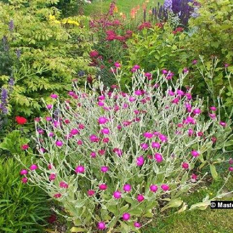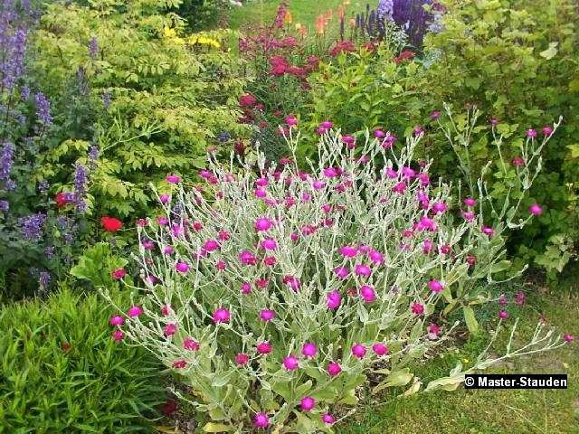 Die kräftig rosaroten Blüten heben sich sehr kontrastreich vom grauweißen, filzigen Laub ab. Sehr Trockenheitsverträglich!