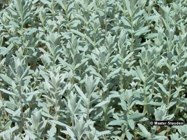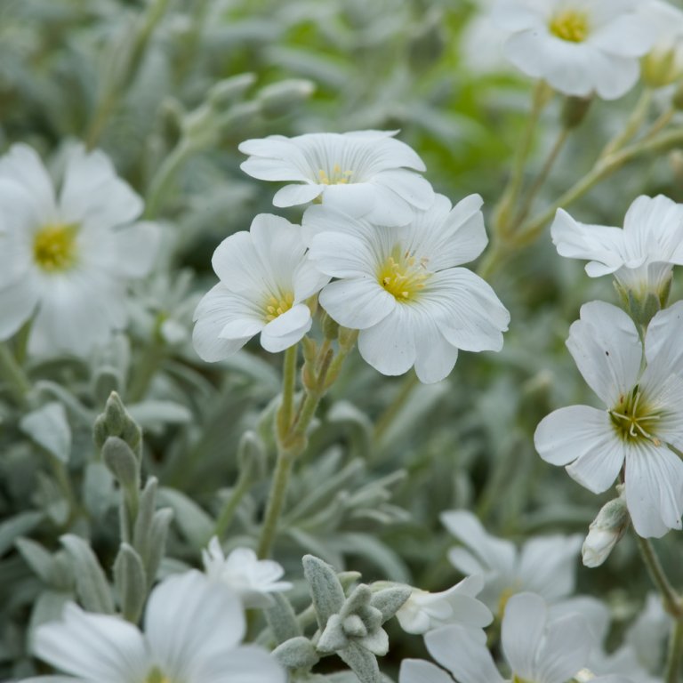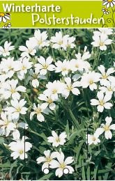 Hornkraut bildet mit seinen weißfilzigen Blättchen größere Polster, die sich im 5 mit weißen Blütchen bedecken. Glockenblumen, Lein und Seifenkraut sind ideale Begleiter.