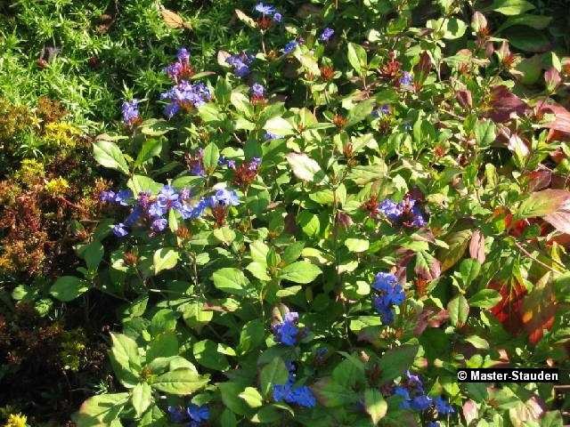Diese ganzjährig schöne Pflanze ist in China beheimatet. Sie liebt einen sonnigen bis halbschattigen Standort und für kalkhaltige, durchlässige Böden. Der Bleiwurz eignet sich zur Begrünung von trockenen Böschungen und Trockenmauern. Erst spät im Frühjahr treibt er mit rötlichem Laub aus. Von August bis Oktober leuchten azurblaue Blüten, das Herbstlaub wird wieder rot. Ideale Nachbarn sind Ziest, Wolfsmilch und Herbstmargeriten.