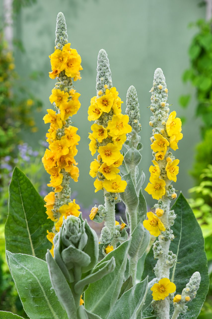 Aus den großen, mit grauweißen Filzhaaren überzogenen Blattrosetten erhebt sich der prächtige, leuchtend gelbe Blütenstand. Die Königskerze gedeiht am besten freistehend, auf mageren, sandig-durchlässigen, trockenen Böden in voller Sonne. Die majestätische Gestalt dieser interessanten Solitärstaude wird sie immer begeistern. Eine hübsche Gemeinschaft bildet sie mit Kugeldistel, Brennende Liebe, Prachtscharte und verschiedenen Gräsern.