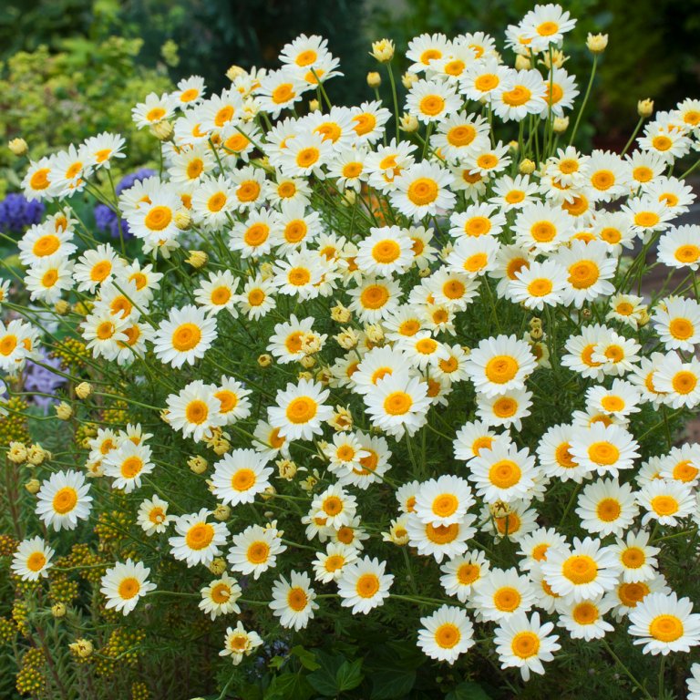 Einfache strahlenförmige weißgelbe Tellerblüte mit kräftig gelber Mitte. Dauerblüher. Ein Rückschnitt Ende August führt zu einer neuen Bestockung und erhöht die Lebensdauer.