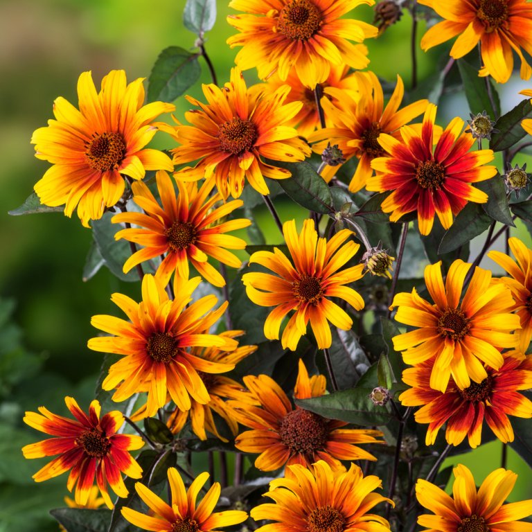 Das Sonnenauge 'Burning Hearts' vereint die Eigenschaften als Blattschmuck- und als Blütenstaude in einer Pflanze. Sie bildet mit ihrem dunklen Braunroten Trieben und Blättern ansehnliche Horste.Darüber leuchten strahlend gelbe Blüten, die sich zur Mitte hin orange-rot verfärben. Heliopsis können zehn Jahre oder länger am gleichen Platz stehen, ohne ihre Blühwilligkeit einzubüßen.