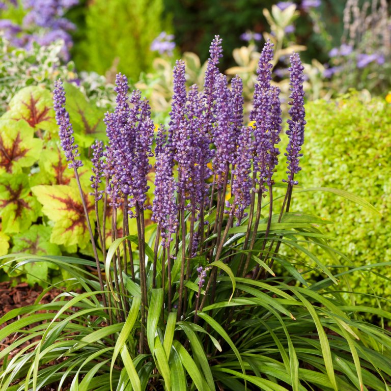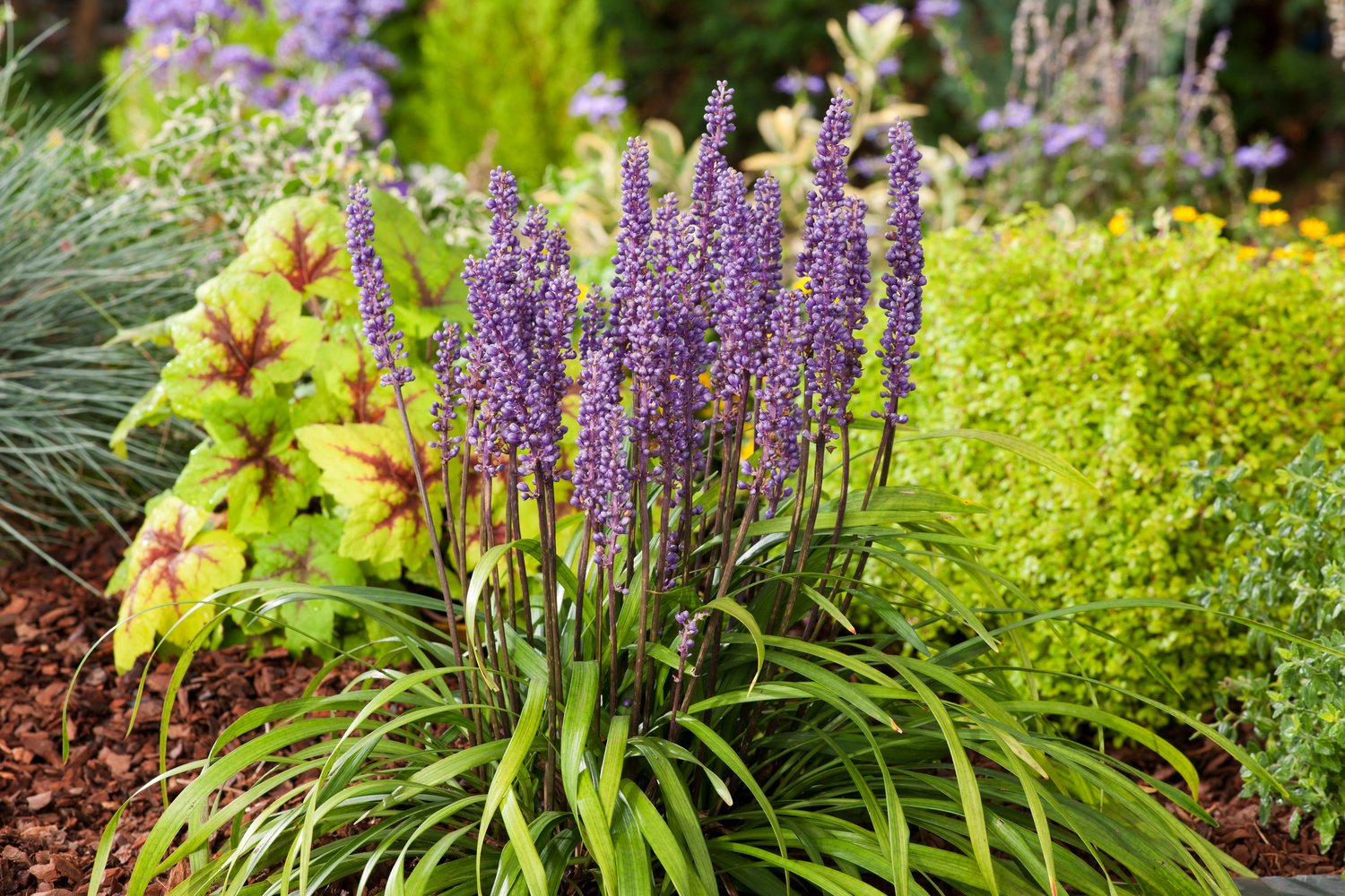 Trotz ihrer schmallinealen, grasartigen Blätter zählt die Liriope nicht zu den Gräsern sondern zu den Maiglöckchengewächsen. Sie stammen aus Ostasien und geben mit ihrem langsamen, horstigen Wuchs ausgezeichnete Bodendecker ab. Die Sorte 'Moneymaker' hat besonders lange, über dem Laub stehende Blütentrauben. Durch die relativ späte Blütezeit ergeben sich schöne Herbst-Aspekte. Für feuchten bis frischen, humusreichen und schwach sauren Boden im Halbschatten bis Schatten.