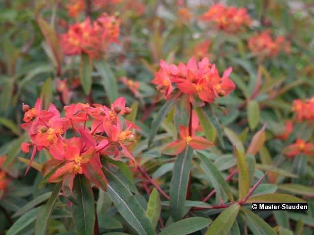 Die Blüten aller Wolfsmilcharten sind Hochblätter, die sich mit dem Austrieb entwickeln. Die eigentlichen Blüten sind relativ unscheinbar. Nicht nur die Hochblätter sind leuchtend rot, auch das Laub färbt sich im Herbst prächtig um. Diese aus dem Himalaja stammende Wolfsmilch bevorzugt feuchte, nahrhafte Böden an sonnigen bis halbschattigen Standorten. Sie ist eine wertvolle Wildstaude, die sich zur Unterpflanzung lichter Gehölzbestände eignet und sich gut durch Ausläufer verbreitet. Ein Winterschutz aus Herbstlaub ist zu empfehlen.